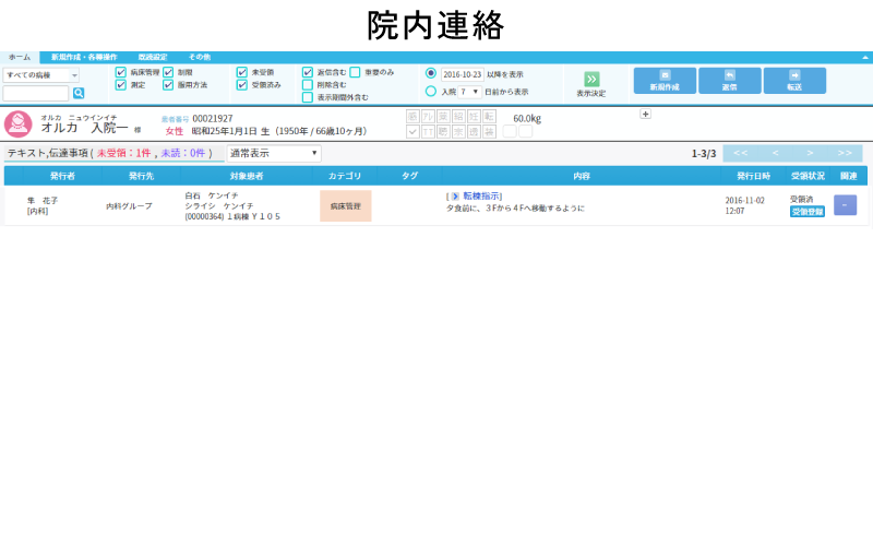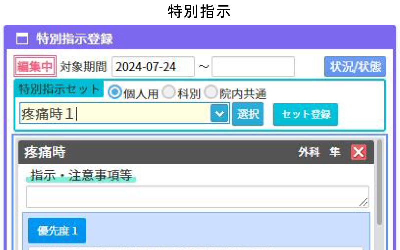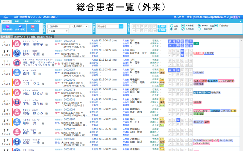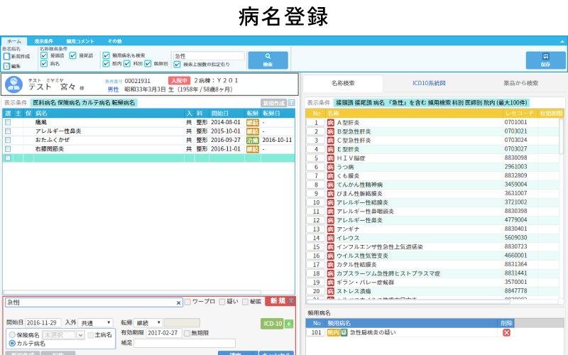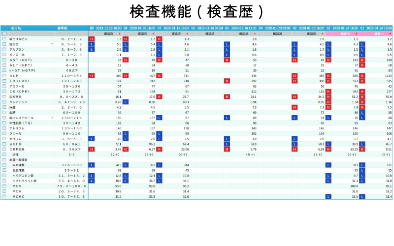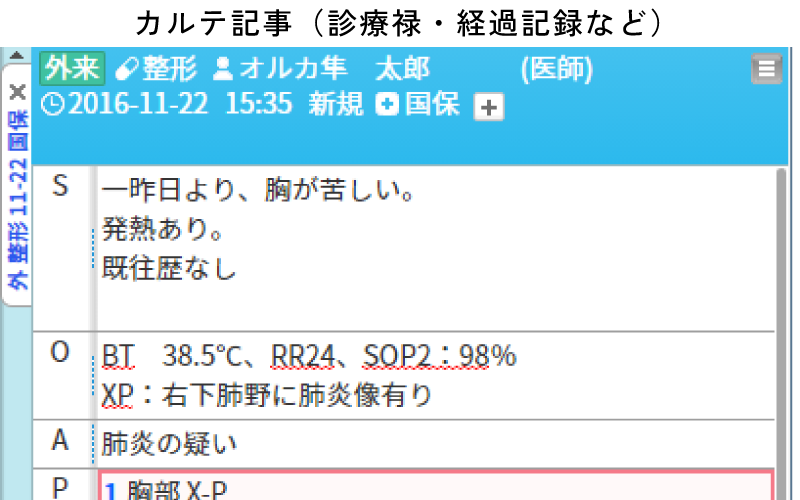 診察情報や看護情報、オーダー情報などそれぞれの情報に対して「タグ」を配置することで、タグ情報をもとに薬・診療科・検査日など自由な要件で検索することができます。